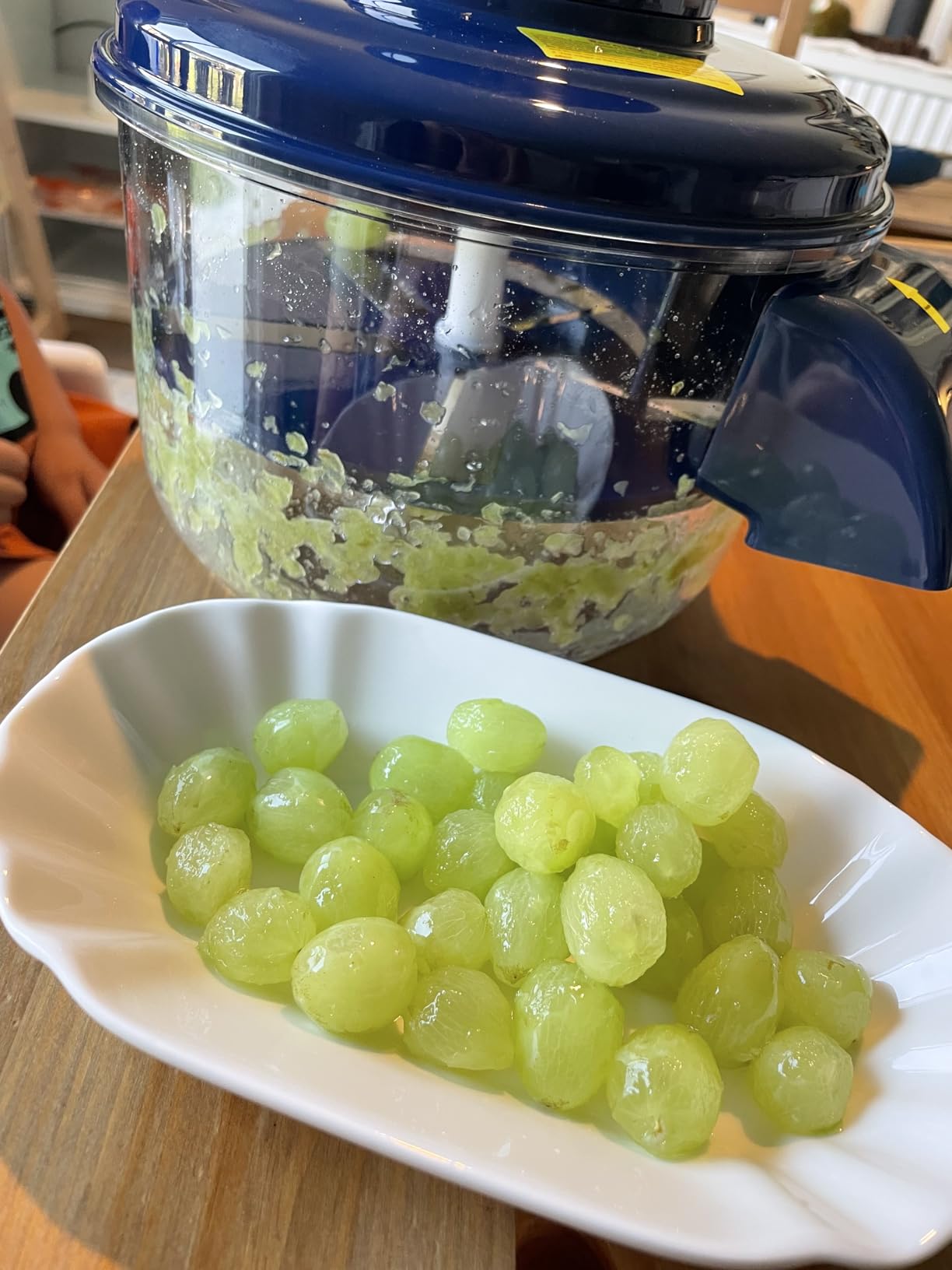 "استخدمته لتقشير العنب،العيال منبهرين فيه مثالي للصغار و الكبار، لأن ما فيه قشر ممكن يعلق في الحلق، يعني أكثر أمان. يشتغل تمام، في ثواني بس وتلقى عندك صحن كامل عنب مقشّر! ما عاد فيه طعم مرّ للمبيدات العلقة بالقشر، والعيال يحبون العنب أكثر الحين!"